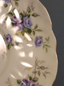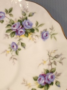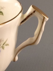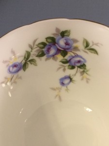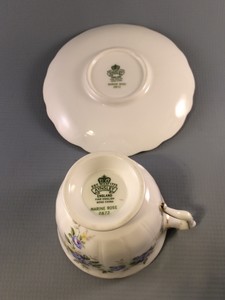 This lovely teacup and saucer was made by Aynsley and is their pattern number 2872. The pattern name is Marine Rose and it is in the crocus shape. The teacup measures 4 1/8″ long, is 3 3/8″ in diameter and stands 2 7/8″ high on a footed base. The saucer is 5 5/8″ in diameter. Both pieces have a scalloped rim and gold trim, and feature sprays of small blue roses. They are in excellent condition, with no chips, cracks or repairs.